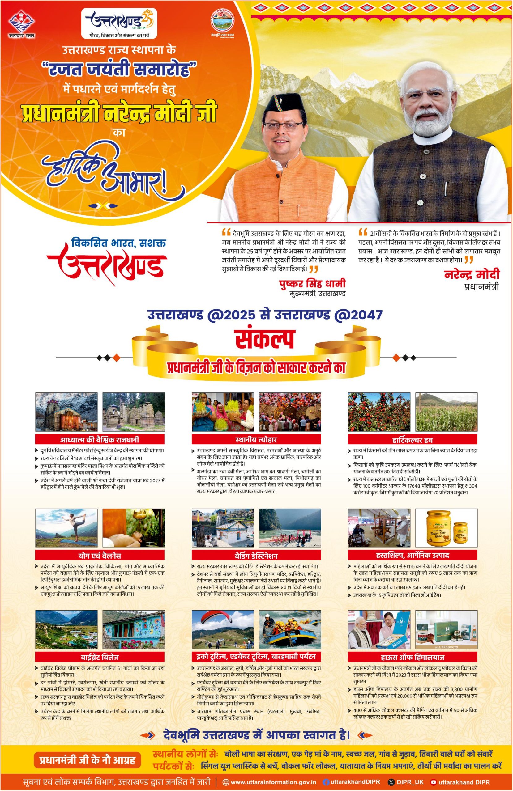 राज्य सरकार का “उत्तराखंड @2025 से उत्तराखंड @2047” संकल्प—नये, आधुनिक, सशक्त और विकसित उत्तराखंड के निर्माण की दिशा में एक ऐतिहासिक पहल है, जहाँ परंपरा और प्रगति का अद्भुत संगम दिखाई देता है।