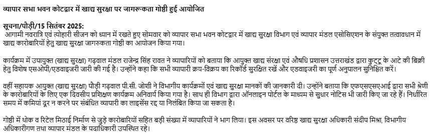 ✵ व्यापार सभा भवन कोटद्वार में खाद्य सुरक्षा पर जागरूकता गोष्ठी हुई आयोजित डाउनलोड अनुलग्नक : ⚜